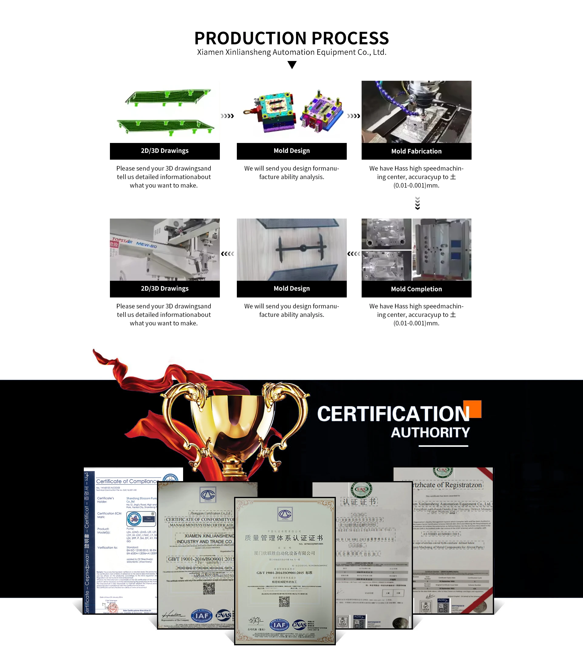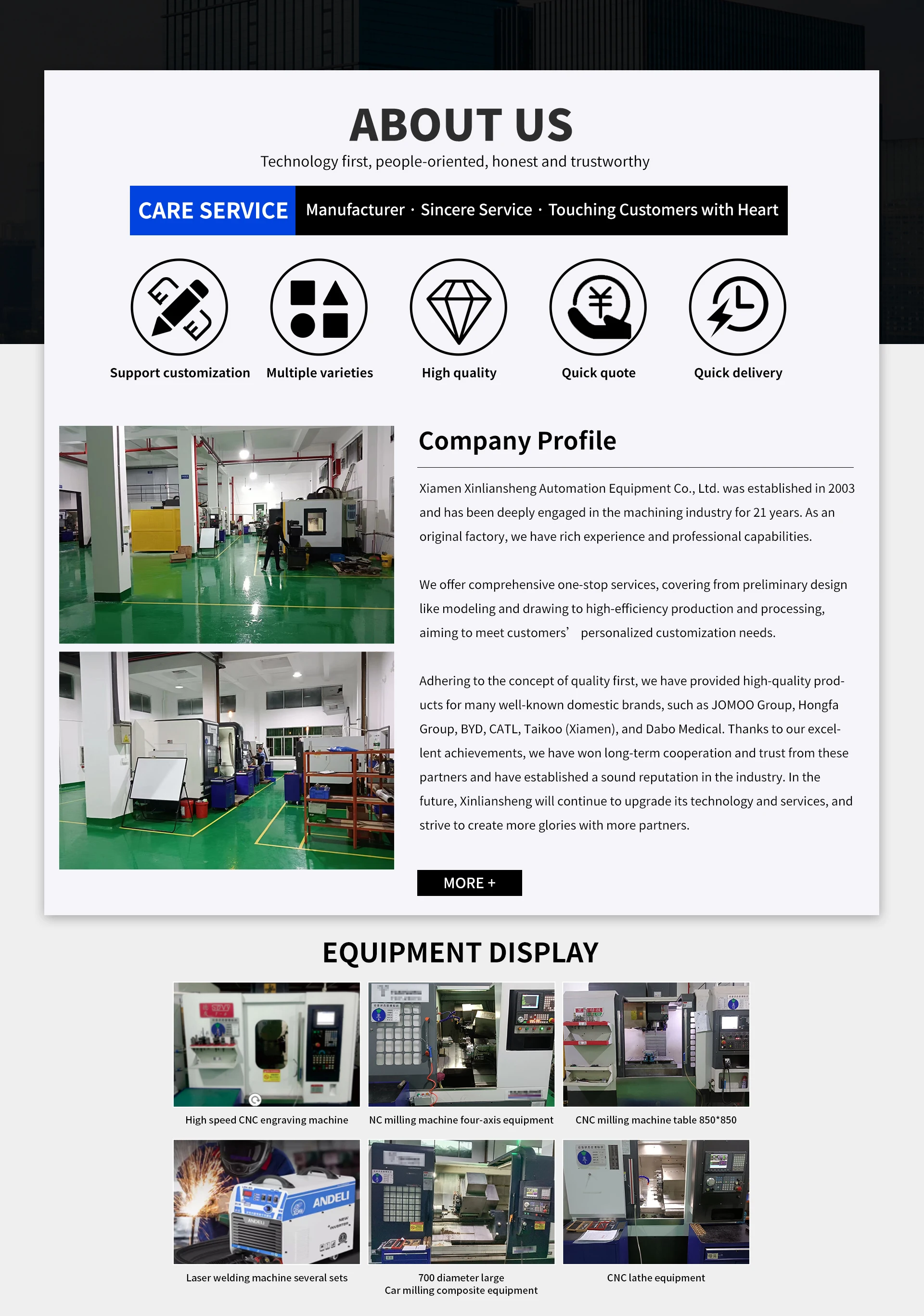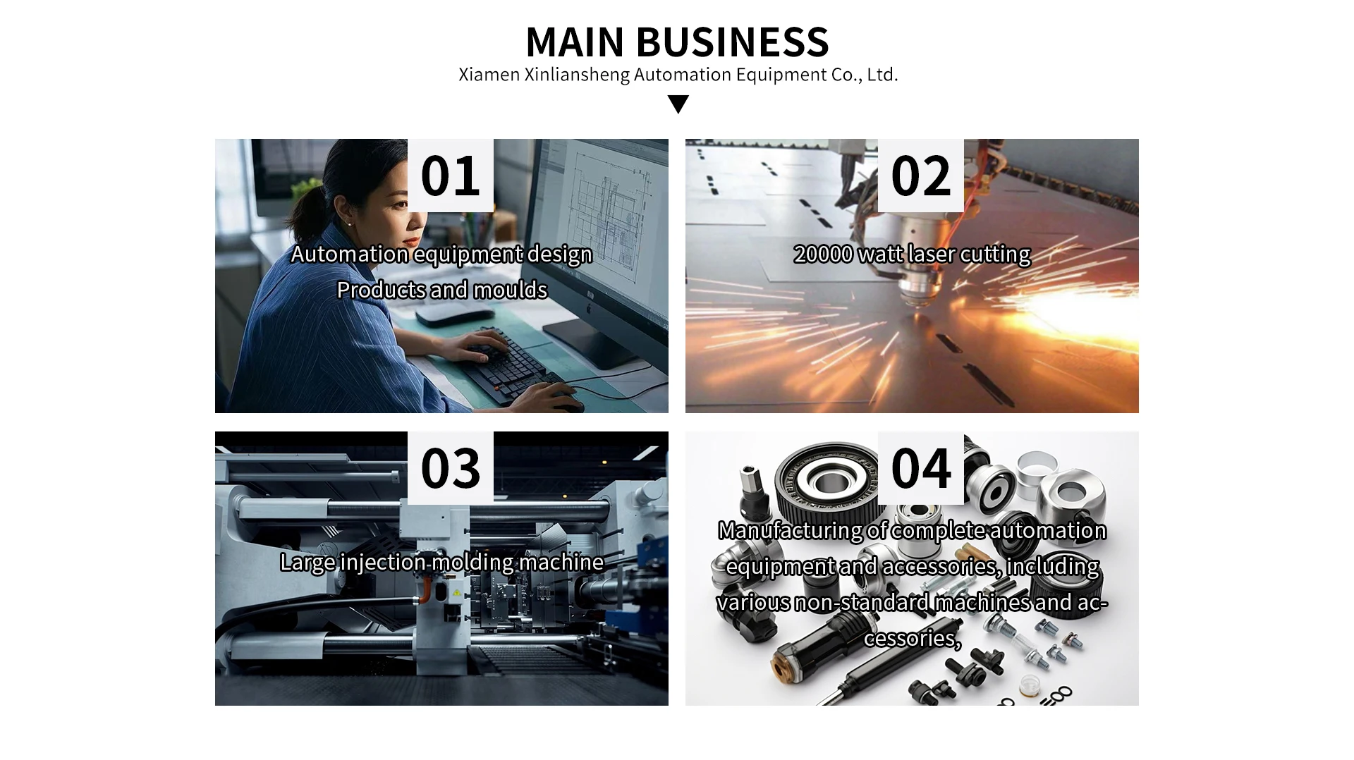 Xiamen Xinliansheng Automation Equipment Co., Ltd. Productos principales:Mecanizado de precisión CNC y torneado y fresado compuesto de piezas de mecanizado de 4 ejes, estampado y chapa, piezas de fundición a presión, procesamiento de cinco ejes grande de 3 metros y procesamiento de accesorios de aviación, producción de moldeo por inyección y moldeo por inyección de productos